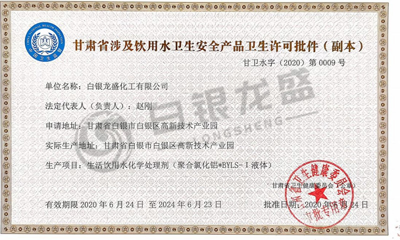 甘肅省涉及飲用水衛(wèi)生安全產品衛(wèi)生許可批件
